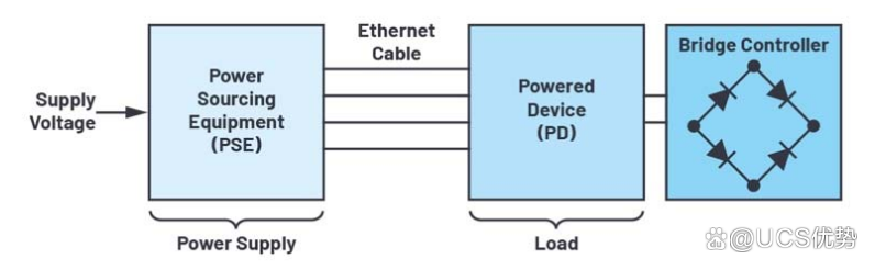 PSE的任务是像电源一样输送电力,而PD接收电力并使用它(负载)。PSE设备在通电时有一个签名过程,以保护不兼容的设备在连接时免受损坏。这包括首先检查PD的特征电阻。仅当该值正确(25kΩ)时,PD才会通电。如果PSE检测到局部放电,它从分类开始;也就是说,确定所连接设备的功率需求。为此,PSE施加规定的电压并测量产生的电流。PD根据电流水平被分配到一个功率等级。如果一切正常,将提供全部电压和电流。PD供电后,其任务是将–48V的PoE电压转换为适合终端设备的电源电压。在典型的PD设计中,使用一个额外的DC-DC转换器(二极管电桥控制器)。它的任务是调整或满足PD提供的组件的功率要求。较新的IC已经提供了将接口和dc-to-dc转换器集成到单个低功耗器件中的可能性,从而简化了设计。